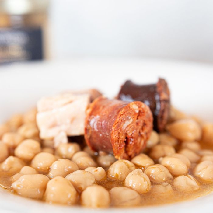Los garbanzos, previamente hidratados, se cocinan junto con chorizo, morcilla y panceta, creando un caldo rico y lleno de sabor. La cocción lenta permite que todos los ingredientes se integren, dando lugar a un guiso equilibrado, contundente y muy representativo de la tradición culinaria.