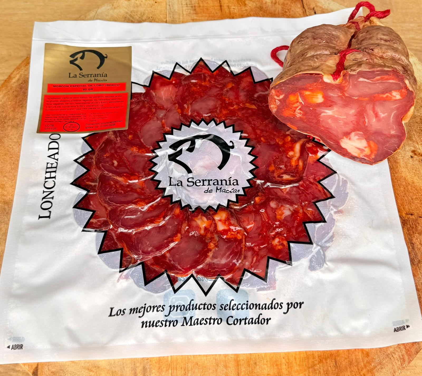 El Morcón Ibérico Extra Loncheado. Se trata de un embutido tradicional de la Sierra de Huelva, elaborado con carne de cerdo ibérico de alta calidad. Este producto se presenta en sobres de 80 gramos, loncheado a máquina y envasado al vacío para garantizar su frescura y sabor.