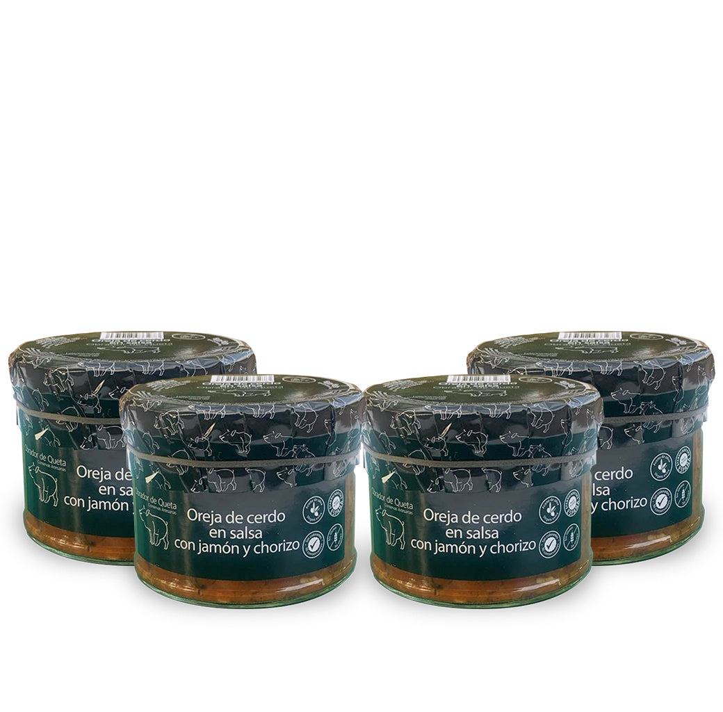 La oreja de cerdo con jamón y chorizo de Obrador de Queta es un guiso artesanal presentado en frasco de 440 g, elaborado sin conservantes ni gluten.