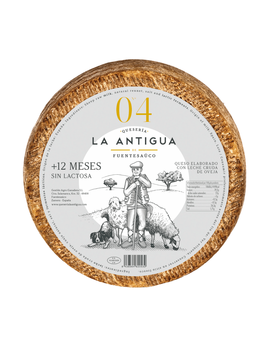 Queso añejo de oveja sin lactosa con más de 12 meses de maduración en bodega natural, ofrece un sabor potente y profundo, textura firme y complejidad aromática.