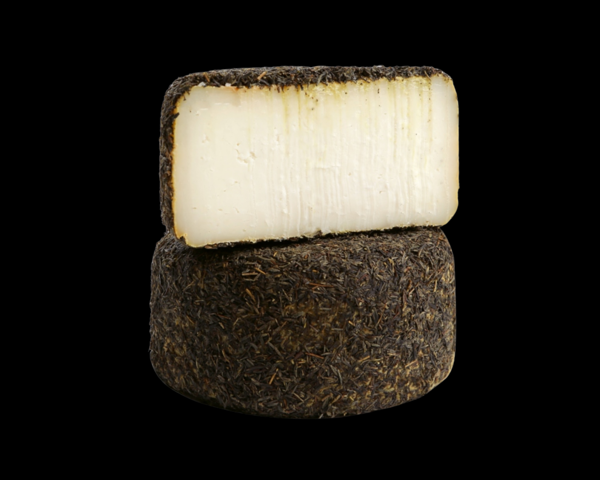 Queso de cabra recubierto de tomillo. Aporta matices suaves y de textura agradable, ideal para acompañamiento variado en todo tipo de platos.